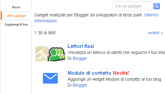 Ora occorre scegliere la posizione in cui inserire il modulo di contatto. Una buona collocazione potrebbe essere nella sidebar laterale del template o nello spazio a fondo pagina (footer). Presa questa decisione clicchiamo sul relativo collegamento “Aggiungi un gadget”. Nella finestra di selezione del gadget clicchiamo sulla sezione “Altri gadget”, qui individuiamo l’elemento chiamato proprio “Modulo dei contatti” e clicchiamo sul relativo pulsante “+” per configurarlo.