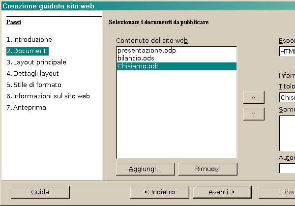 Al passo 1 (“Introduzione”) troviamo alcune informazioni generali che possiamo accettare senza modifiche. Procediamo cliccando su “Avanti”. Al passo 2 (“Documenti”) invece dovremo indicare ad OpenOffice quali documenti inserire nel sito; possiamo farlo attraverso il pulsante “Aggiungi”. Al passo successivo (“Layout principale”) potremo scegliere la forma che avrà la pagina principale del nostro sito che conterrà i collegamenti ai vari documenti. Al passo 4 (“Dettagli di layout”) abbiamo la possibilità di effettuare alcune scelte stilistiche ed in particolare di specificare una risoluzione per l’ottimizzazione del sito.