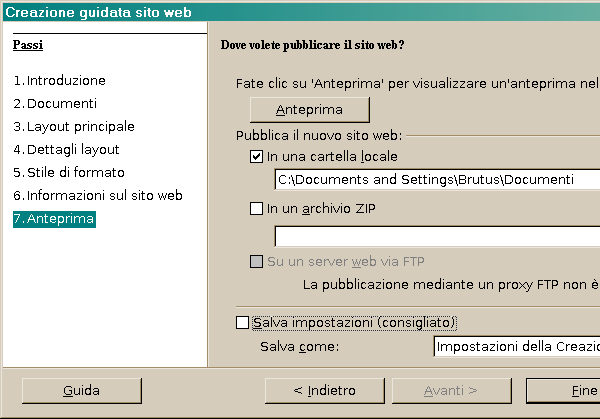 Passati al passo 5 (“Stile di formato”) potremo scegliere tra diverse combinazioni di colori per il sito e tra diversi stili per le icone. Al passo 6 (“Informazioni sul sito web”) viene offerta la possibilità di inserire un titolo per il sito ed una serie di meta-informazioni HTML utili anche per l’indicizzazione. Al passo 7 (“Anteprima”) infine potremo vedere il sito in anteprima e decidere dove salvarlo. In questo senso OpenOffice permette di salvare tutto in locale in una cartella o in un file ZIP o di pubblicare direttamente in rete tramite il protocollo FTP. Fatte le nostre scelte non dovremo far altro che cliccare su “Fine”.