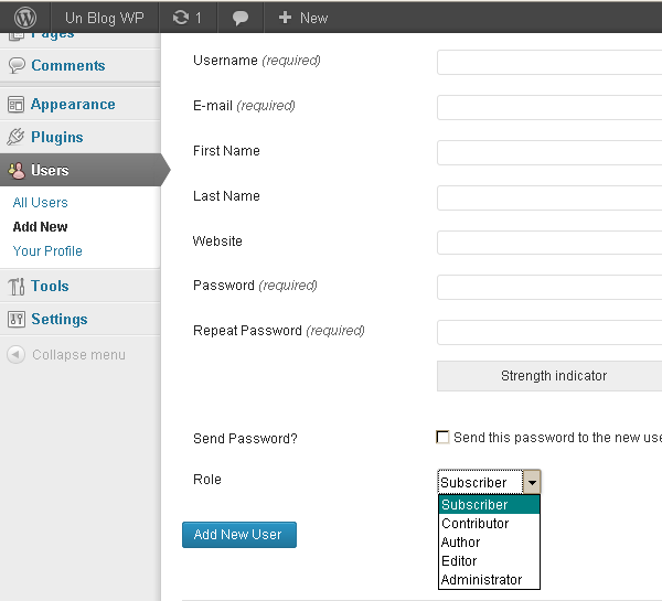 - Per aggiungere un nuovo utente andiamo in “Users > Add New”, compiliamo i campi necessari quindi alla voce “Role” scegliamo nel menù a tendina il tipo di utenza da creare. Confermiamo infine cliccando su “Add New User”.