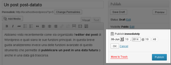 Lo Scheduler di WordPress funziona anche come “macchina del tempo”, permette cioè di inserire un post in una data già trascorsa. La procedura da seguire è identica a quanto abbiamo già visto con l’unica differenza che andremo ad inserire una data antecedente a quella attuale e procederemo alla pubblicazione immediata del post cliccando sul pulsante “Publish”.