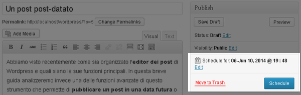 La possibilità di programmare post in date future si rivela una funzione molto comoda per organizzare il lavoro di pubblicazione. Permette infatti di preparare i contenuti quando se ne ha il tempo e calendarizzarne la pubblicazione in modo progressivo. In questo modo si eviterà tanto la pubblicazione di troppi contenuti nello stesso giorno quanto l’eccessiva distanza tra gli aggiornamento del blog.