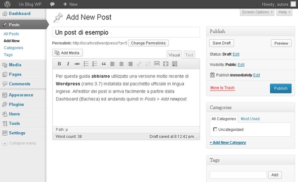 L’editor dei post è il componente di WordPress che permette di creare i singoli post, classificarne il contenuto e procedere alla pubblicazione. Più volte modificato nel corso del tempo, l’editor risulta oggi molto amichevole e permette di gestire tutte le funzioni in maniera rapida ed intuitiva.
